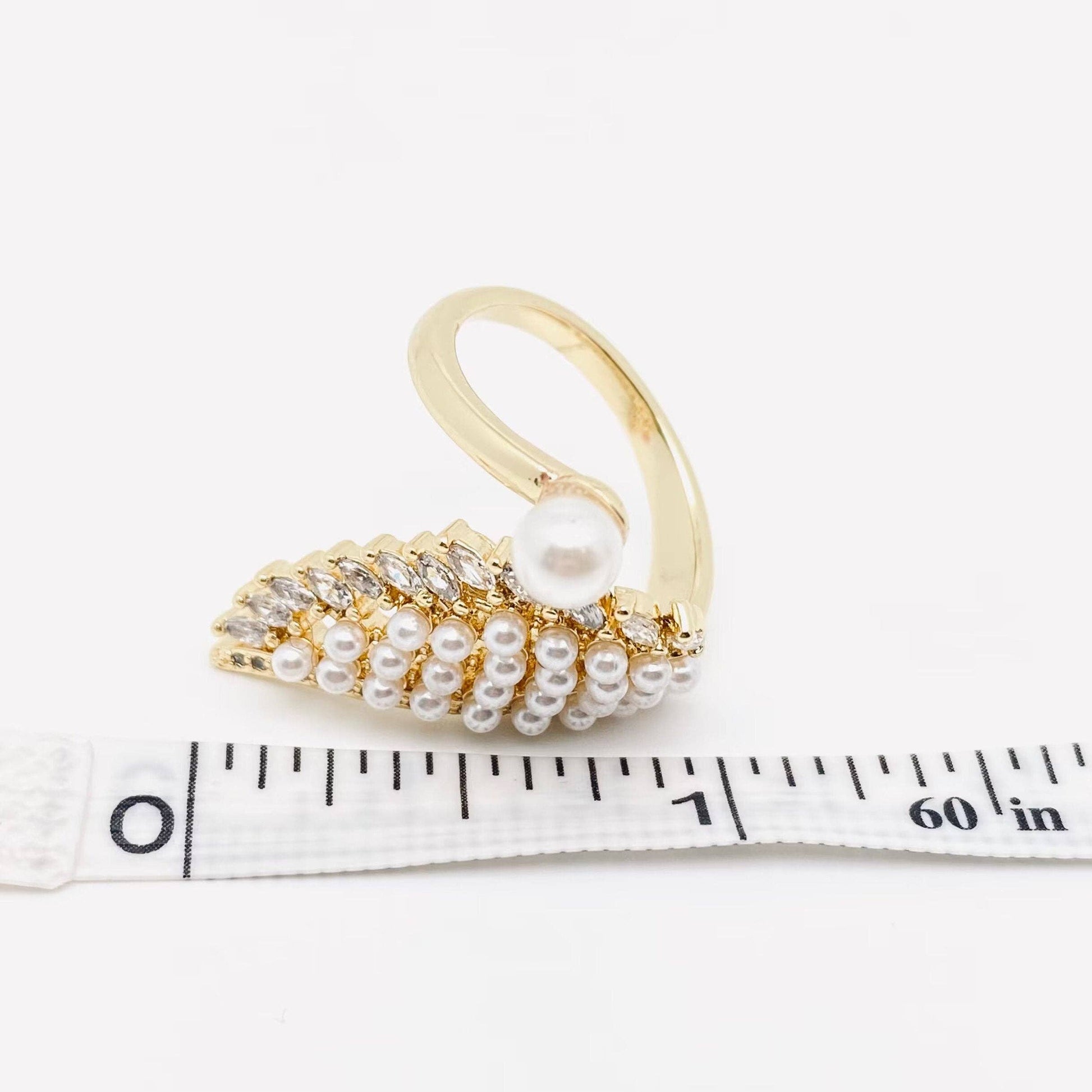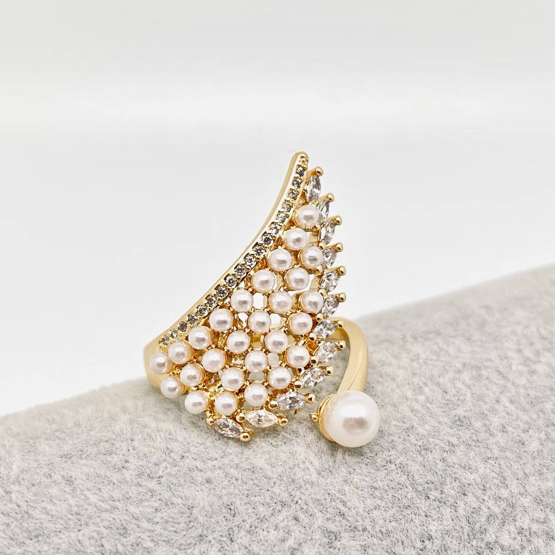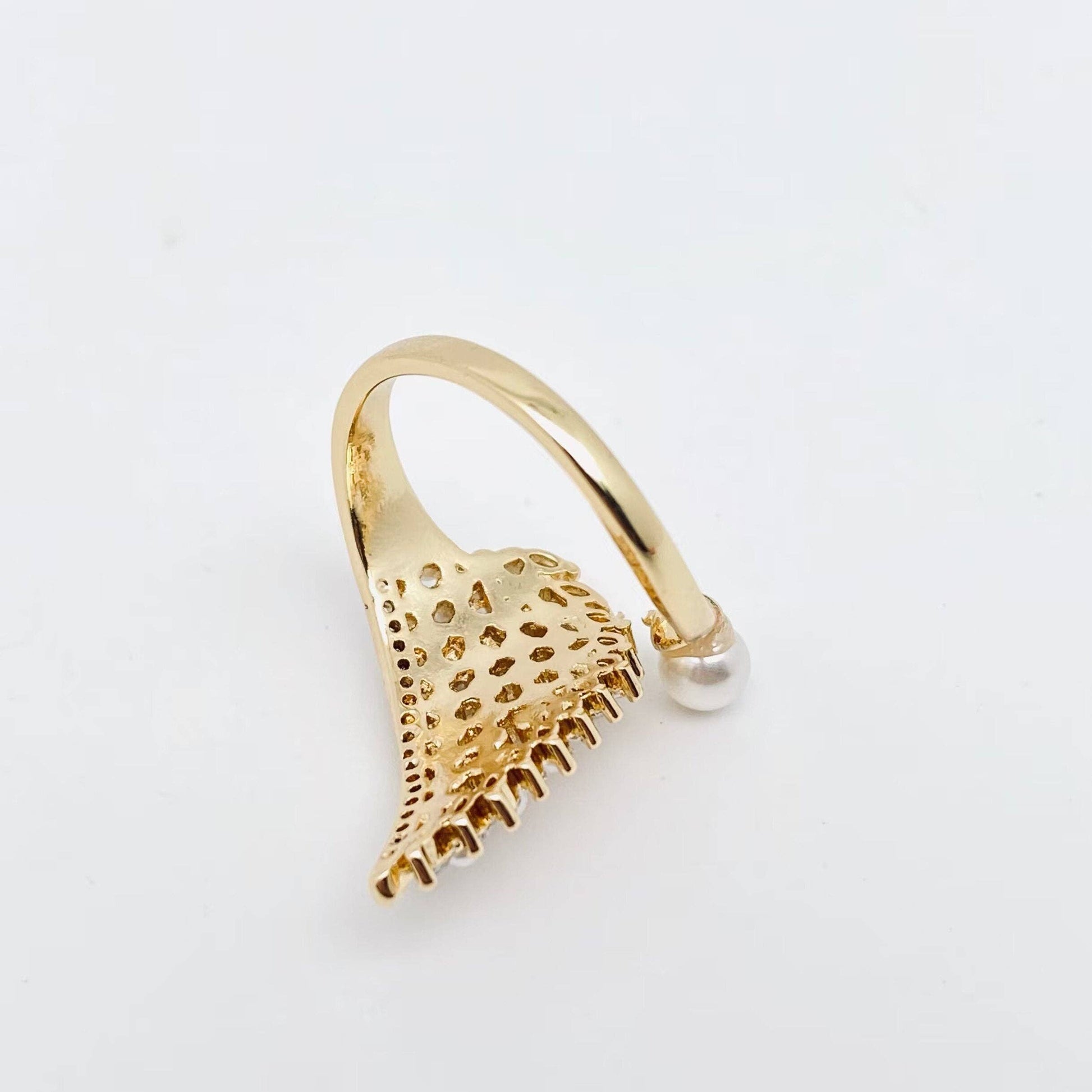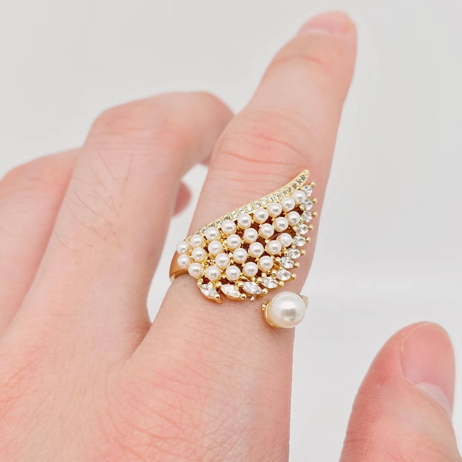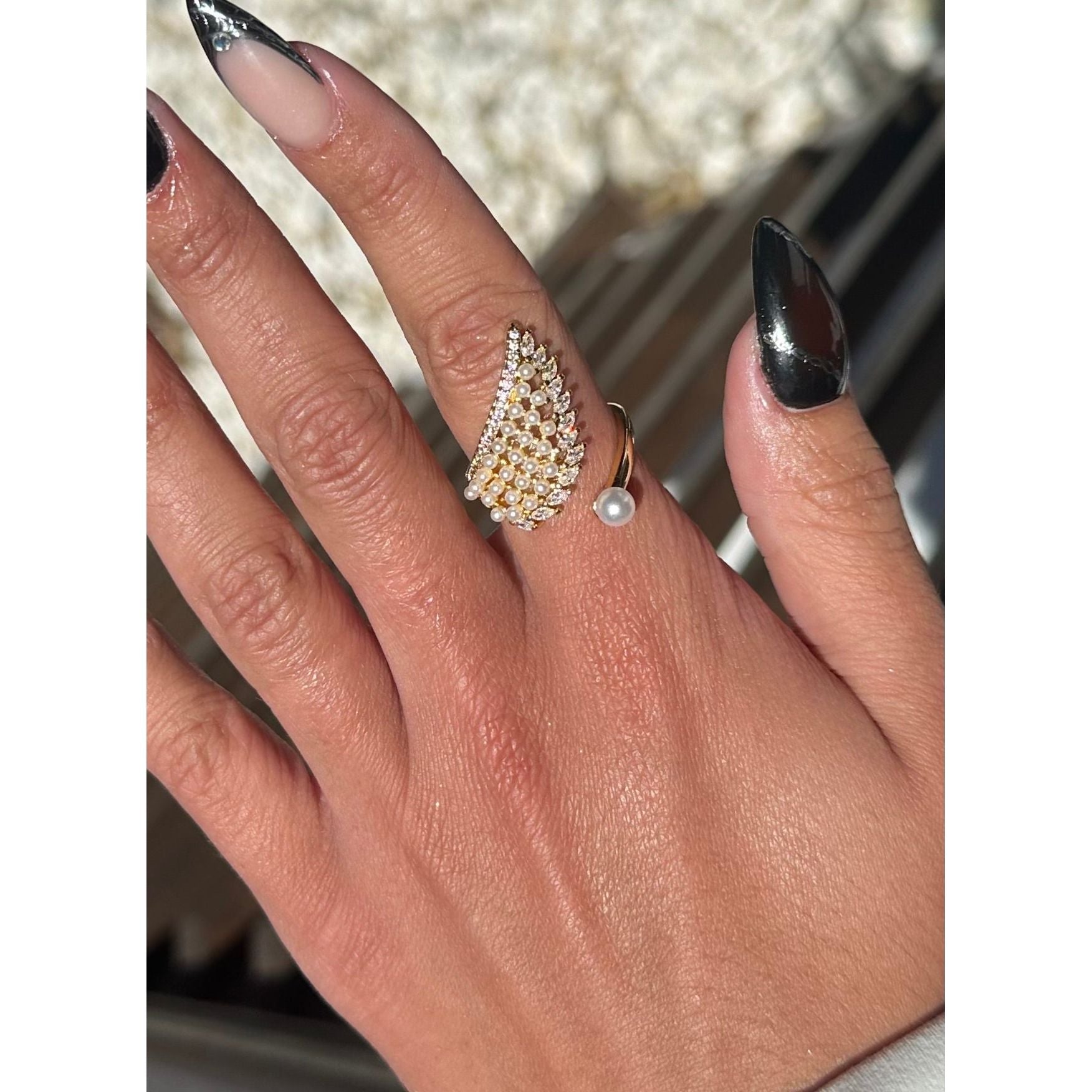 Angel Wings CZ Pearl Adjustable Ring with 18K Gold Plating