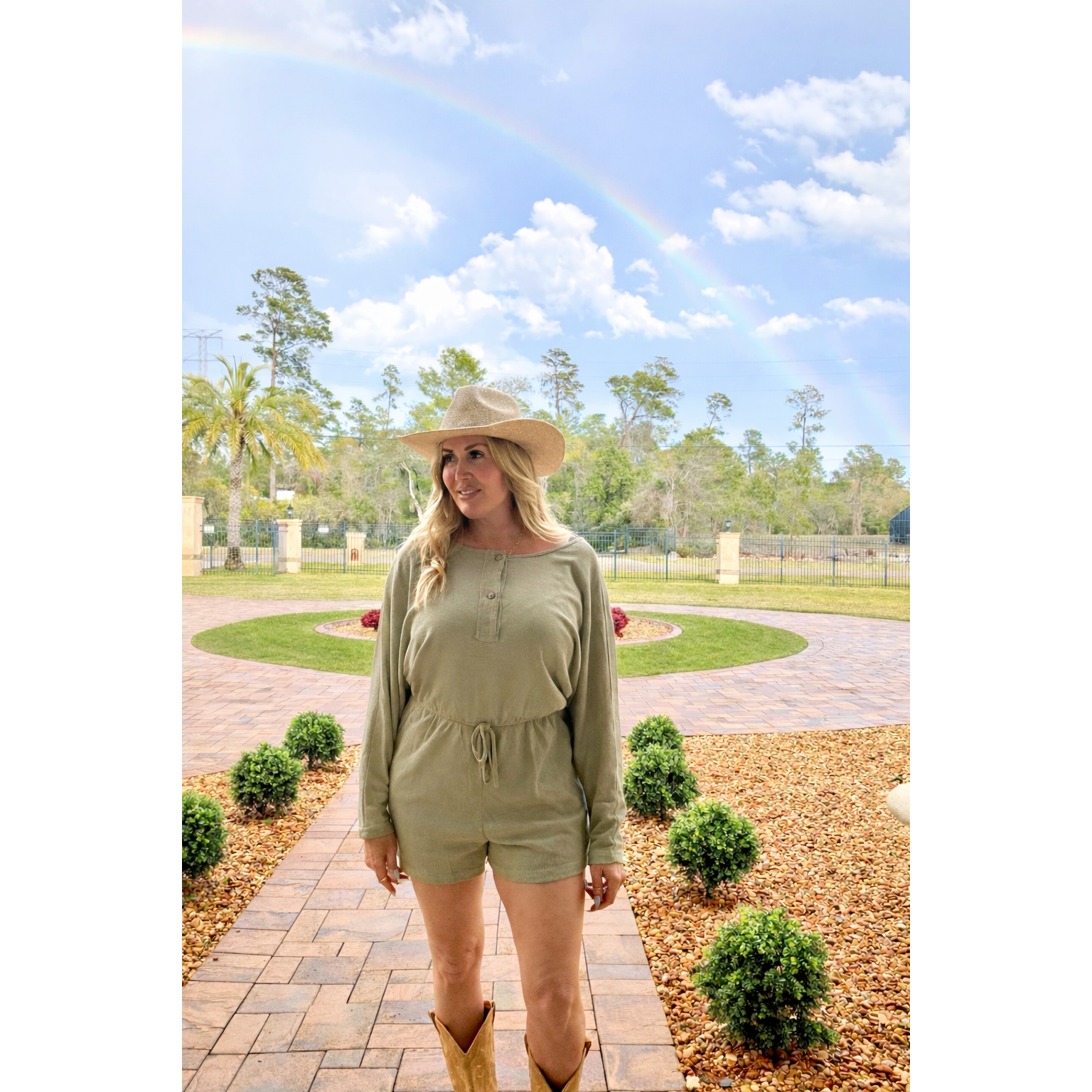 Say hello to your new go-to piece—a shorts romper that breaks all the rules in the best way. Long sleeves add unexpected sophistication while the green drawstring waist lets you customize your silhouette on the fly. Handy front pockets keep your hands free, and the button-front closure with that clever tie detail on top gives you flexibility to style it however you want. Casual never looked this good.