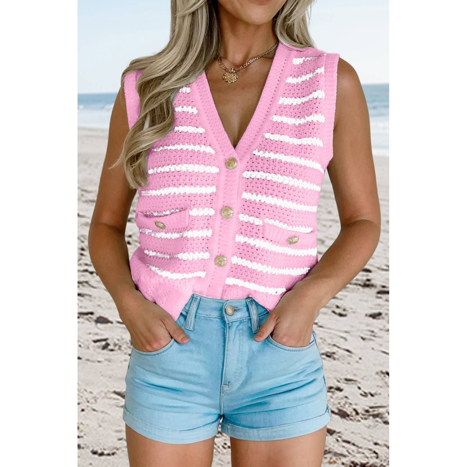 Effortless elegance meets versatile style with this sleeveless wonder that transitions seamlessly from season to season. Adorned with gleaming gold buttons that catch the light just right, it's the kind of piece that works overtime in your wardrobe—dress it up for a night out or keep it casual for weekend vibes. Whether you're layering it through chilly months or letting it shine solo in summer heat, this timeless staple proves that great fashion doesn't need to choose sides.