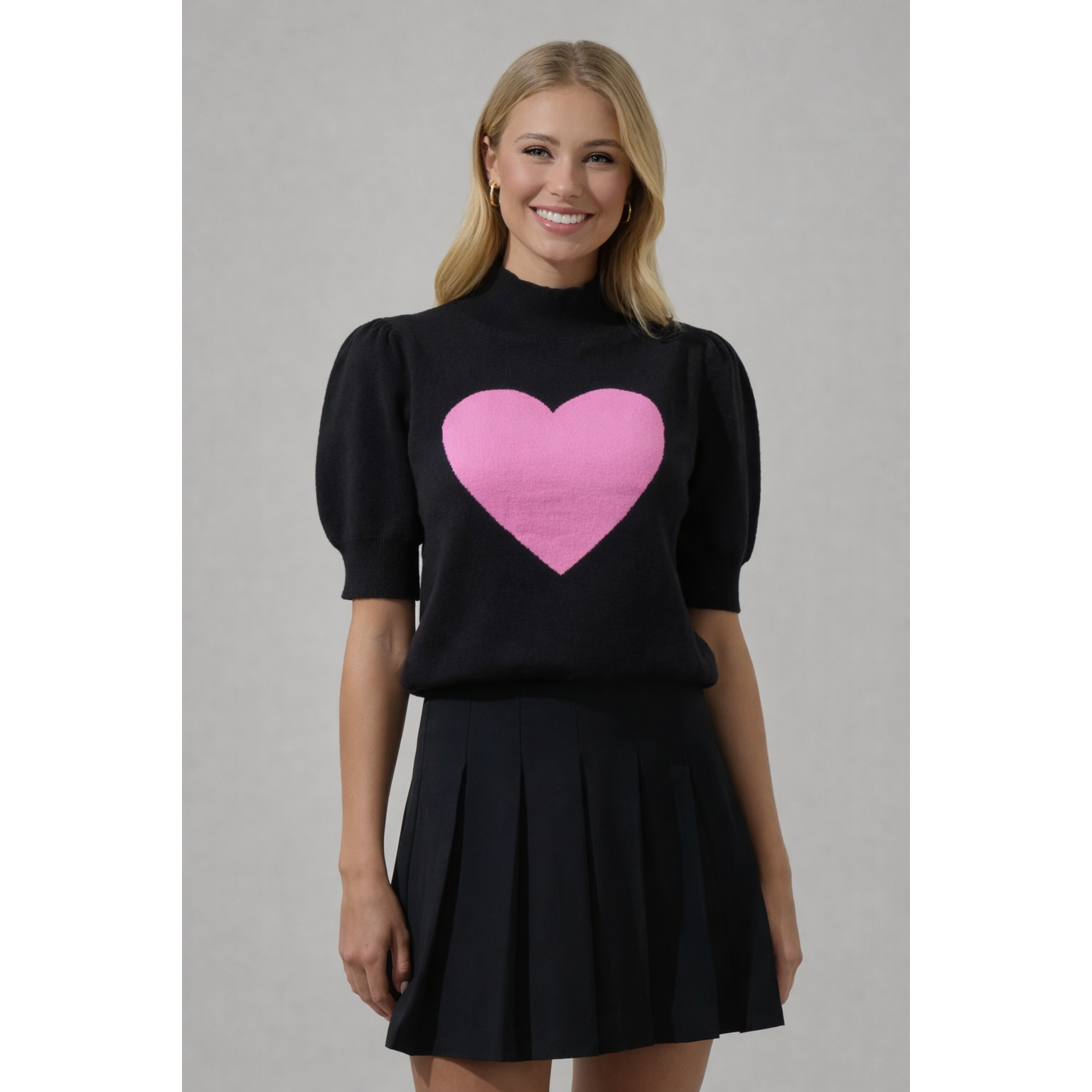 Heart eyes for this sweater! The Russel Heart Putt Sleeve Sweater has short putt sleeve with gathered shoulders and a mock neck. A pink heart in the middle gives it a cute touch. Easy to pair with any bottoms.